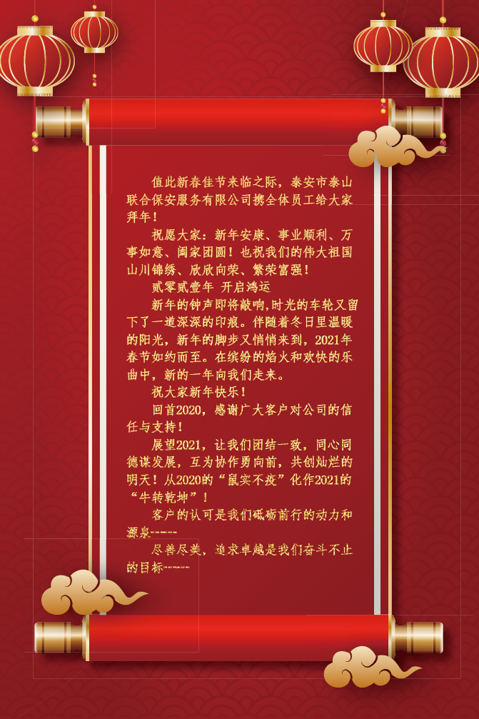 泰安市泰山聯(lián)合保安服務(wù)有限公司簡(jiǎn)介 我們的宗旨是:安全留給客戶(hù),風(fēng)險(xiǎn)我們承擔(dān)。 我們的精神是:堅(jiān)毅、求實(shí)、拓展。 我們的方針是:知法、遵法、守法、依法。 我們的目標(biāo)是:為泰城大環(huán)境的改善,為人民安居樂(lè)業(yè),為市場(chǎng)經(jīng)濟(jì)發(fā)展,為建設(shè)平安和諧泰安作出貢獻(xiàn),為客戶(hù)提供優(yōu)質(zhì)安保服務(wù)。 泰安市泰山聯(lián)合保安服務(wù)有限公司是經(jīng)工商行政管理局登記注冊(cè),山東省公安廳批準(zhǔn)成立,系中國(guó)保安協(xié)會(huì)理事單位,是具有《保安服務(wù)許可證》(魯公保服20130021號(hào))的合法經(jīng)營(yíng)單... >>詳細(xì)