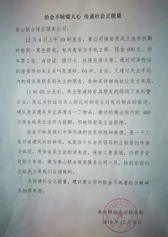 近期,保安公司收到一封來自泰安移動公司送來的感謝信,信中對公司城區(qū)駐移動公司保安隊(duì)員吳立法同志給予了高度評價(jià)。